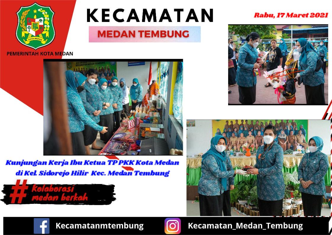 Dalam rangka meningkatkan kinerja PKK Kecamatan dan PKK Kelurahan di Kota Medan Tim Penggerak (TP) PKK Kota Medan semakin gencar melakukan pembinaan. Dibawah pimpinan Tim Penggerak PKK Kota Medan Ny Kahiyang Ayu Muhammad Bobby Afif Nasution didampingi Wakil Ketua I Shaula Arindianti Aulia Rachman beserta tim melakukan kunjungan kerja sekaligus pembinaan lomba tertib administrasi PKK dalam rangka Hari Gerak Kesatuan (HKG) PKK ke -49 di Kelurahan Sidorejo Hilir, Kecamatan Medan Tembung, Rabu (17/03).